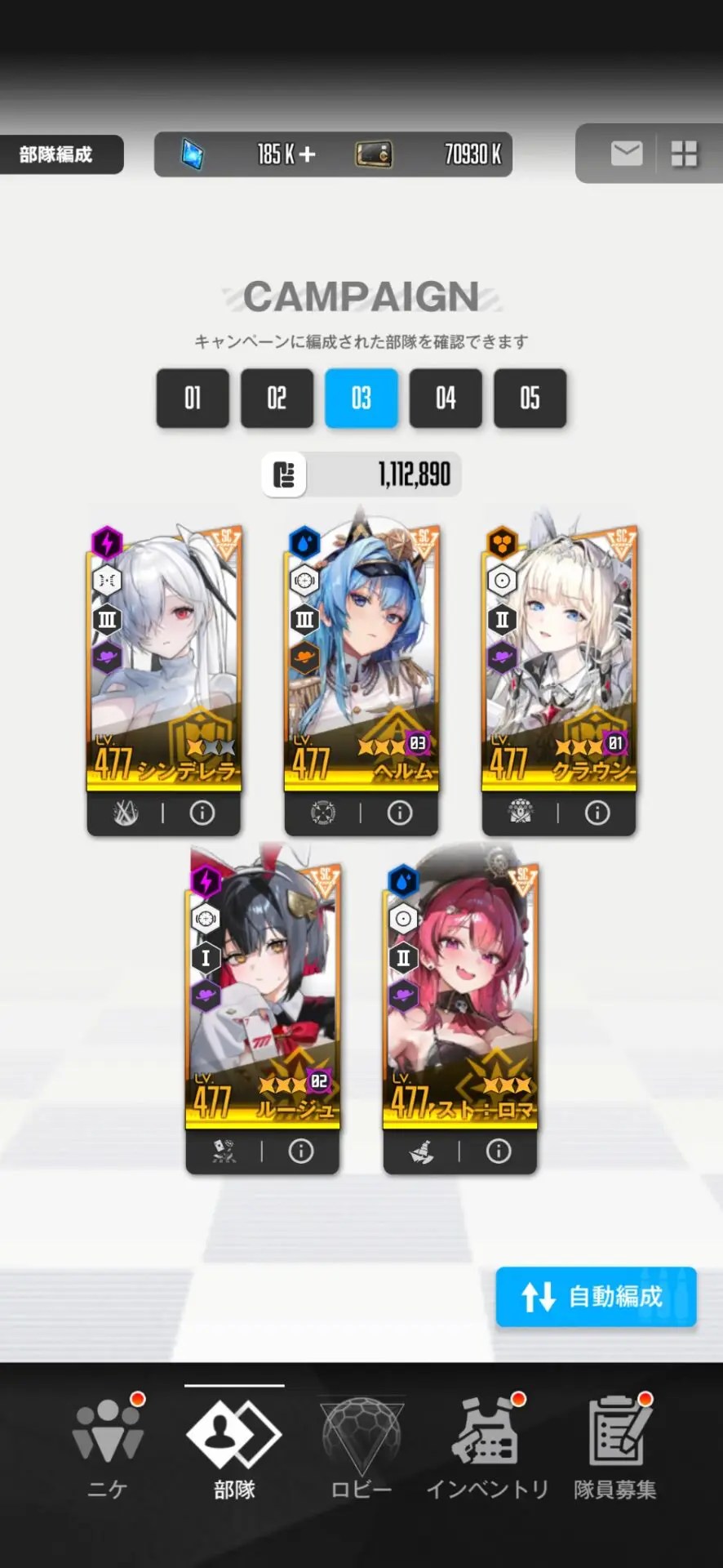 ①配置をシンデレラ、ルージュ、アイン、クラウン、ヘルムに変更